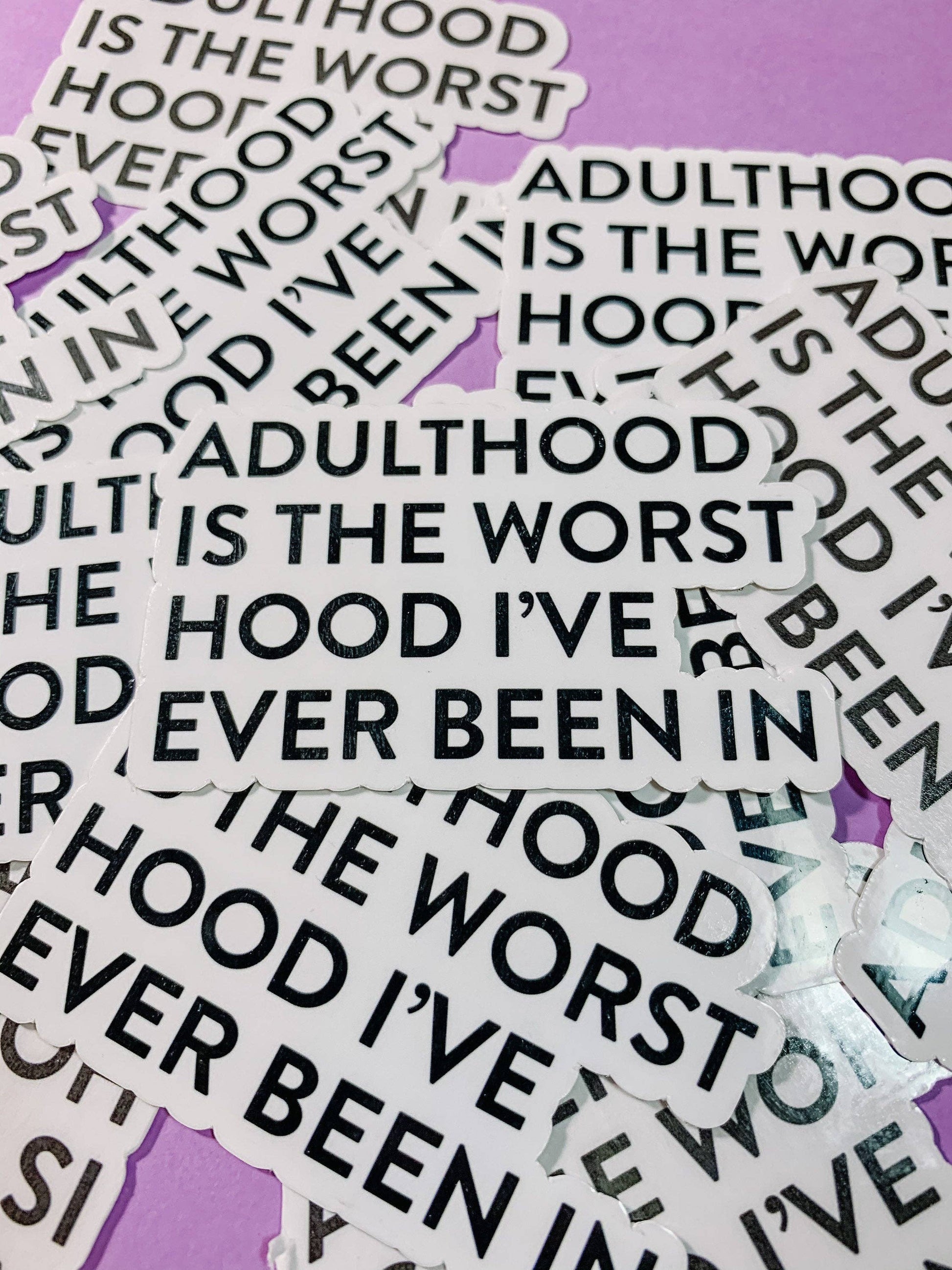 Adulthood is the Worst Hood I Have Ever Been In sticker that tells it how it is.